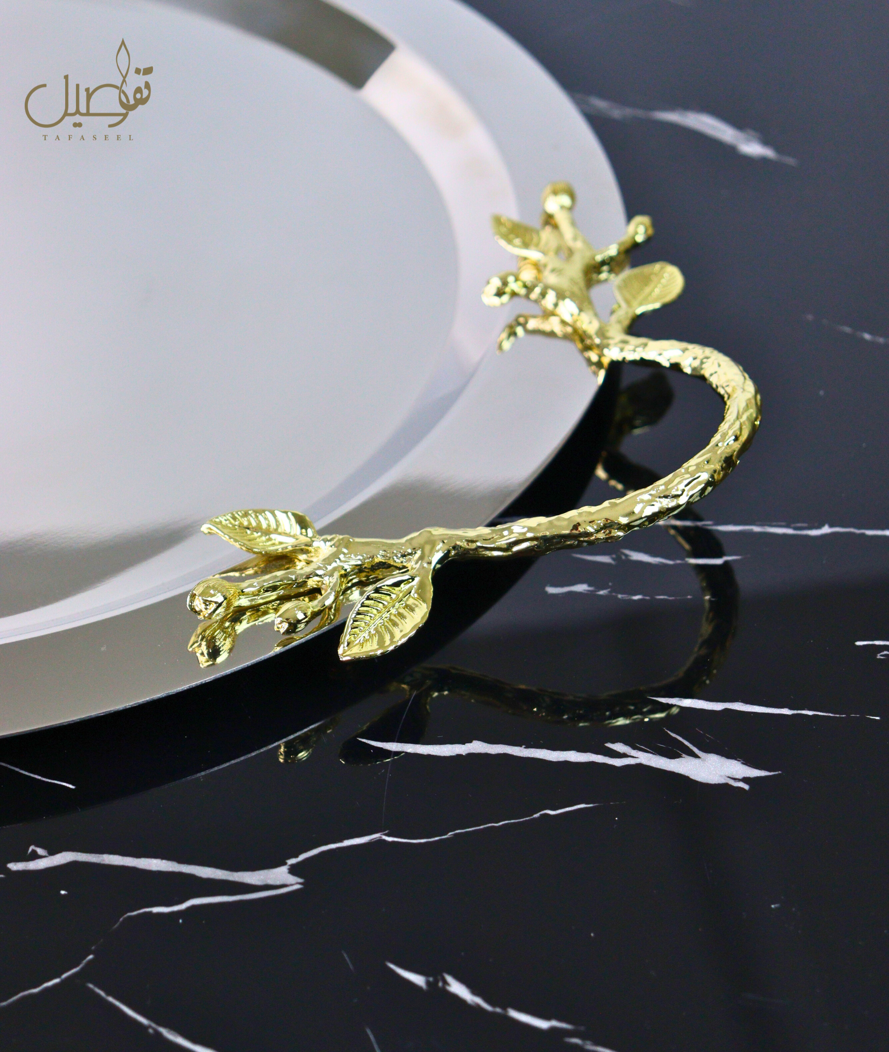 - Coins Brodés : Ajoutez une touche d'élégance à votre service . ce magnifique plateau de service en argent avec des poignées dorées.